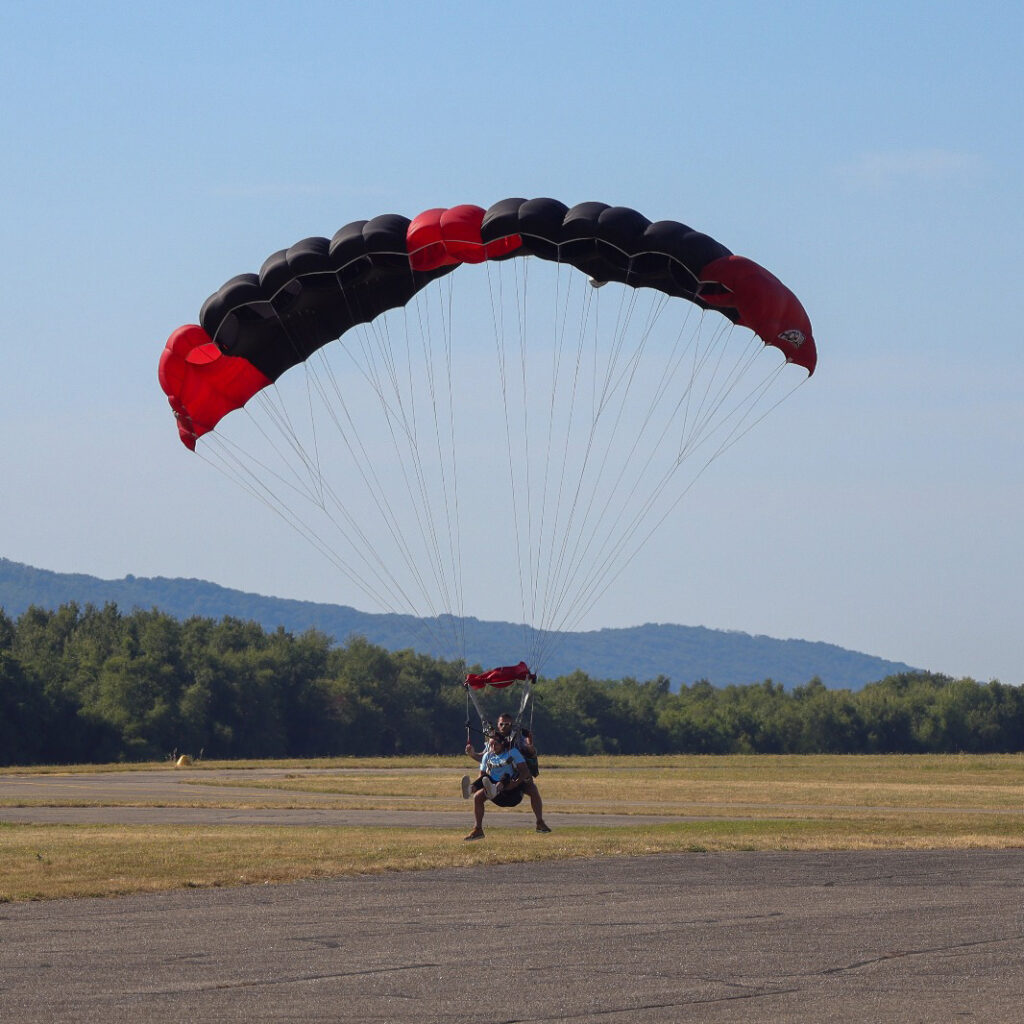 Nous embarquons entre 2 et 4 tandems par rotation. Les sauts s’enchaînent rapidement pour que tout le groupe profite de l’expérience dans le même timing.